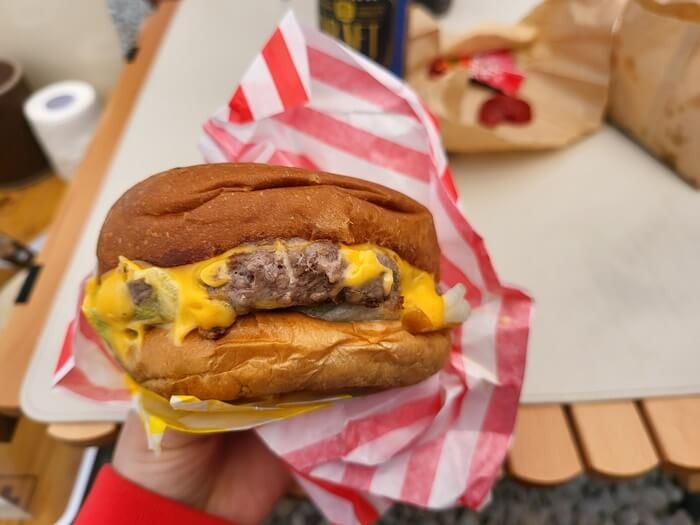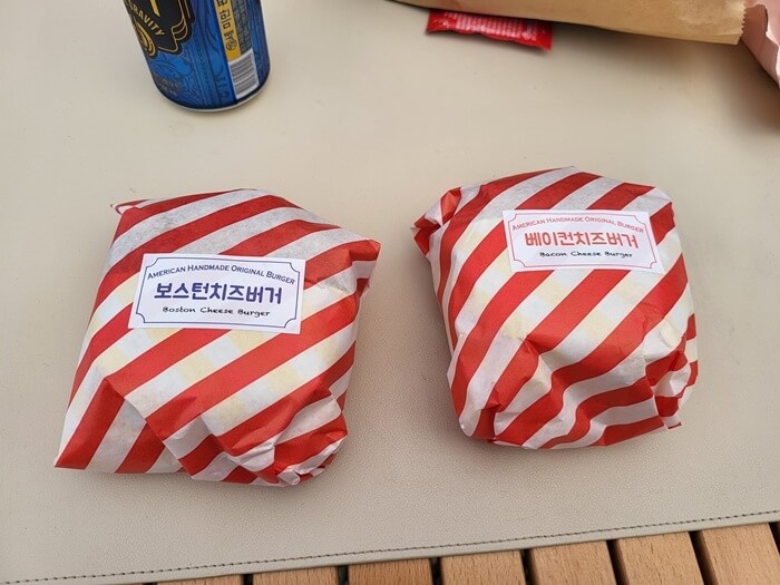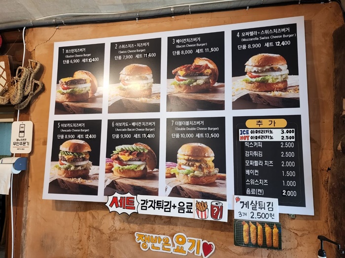 메뉴는 큼직하게 벽에 걸려 있습니다. 저희는 보스턴 치즈버거와 베이컨 치즈버거, 감자튀김을 따로 주문했어요. 캠핑장에 콜라가 있어서 단품으로 구입했습니다.