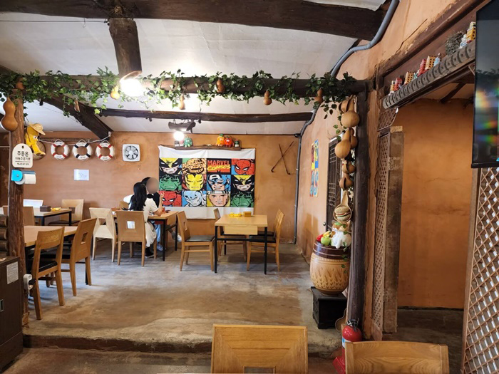 홀 분위기는 사진과 같습니다. 전통적인 초가집 모습에 내부는 황토로 되어있고, 정통 수제버거를 주메뉴로 하는 이색 맛집입니다.