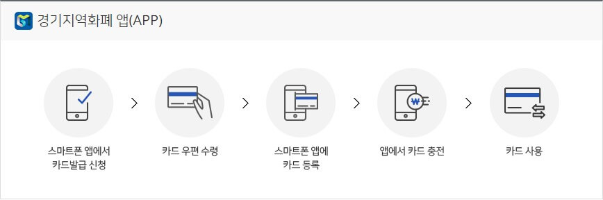 - 본인 명의 스마트폰에서 “경기지역화폐” 어플 설치 → 회원가입 → 카드신청 → 카드등록 → 계좌연결 → 충전 → 카드 사용