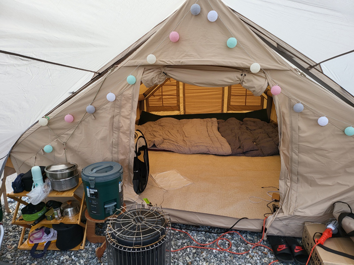 네이처하이크 에어텐트 내부도 꽤 넓습니다. 최고 높이가 2m나 되기때문에 목을 숙이지 않고 편하게 걸어다일 수 있습니다. 이부분은 남편이 정말 좋아하더라고요. 텐트의 안쪽은 저희 네식구가 잘 수 있도록 발포매트 + 좌충매트 + 전기장판+ 이불패드 이렇게 깔았는데요. 엄청 푹신해서 자는데 전혀 불편함이 없었어요. 다음에는 좌충매트는 빼고 세팅을 해보려고 합니다. 짐을 하나라도 줄여야하기에 좌충매트는 다음부터 패쓰~