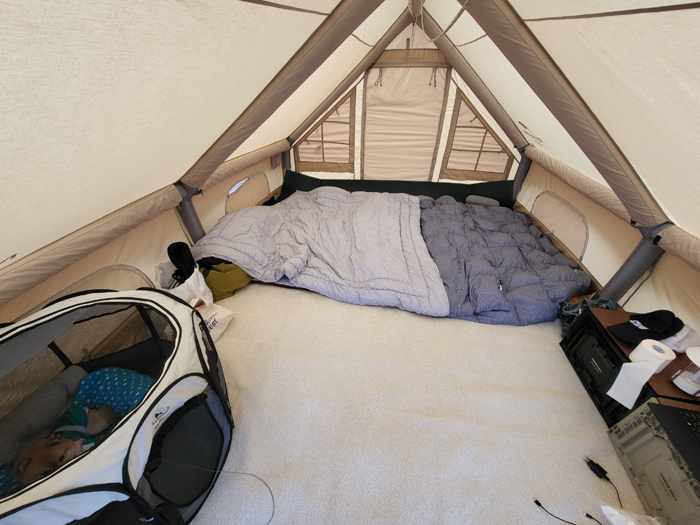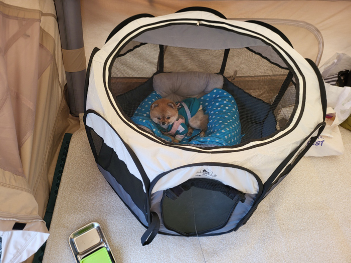 얼마나 아늑한지 자기 텐트에서 꼼짝도 안하는 댕댕이,,,,바깥에서 실컷 산책하라고 데리고 왔더니 파쇄석 바닥이 발이 아픈지 안나가려고해요. 텐트 스커트만 밝으면서 다니다가 결국 자기 텐트로 쏙 들어가더라고요.