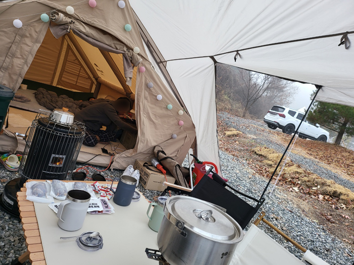 동계캠핑을 하려니 바깥에서 밥을 먹을 수 있도록 테이블 세팅을해야하기에 급하게 아이두젠 A3 차박용 텐트도 따로 구입했습니다. 2번정도 이 조합으로 피칭을 해봤는데 정말 탁월한 선택이었어요.