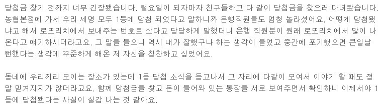 정말 부러운일이 아닐 수 없습니다. 당첨된 분들은 얼마나 좋을까요? 이분도 그렇지만 로또리치에서 로또1등에 당첨된 분중에는 얼마후 2등에 또 당첨되었다는 후기도 있더라고요. 천운을 타고 나는건지,,,매주 5등 5천원 당첨되는것도 가뭄에 콩나듯한데,,,그저 부럽다는 말밖에 안나옵니다.