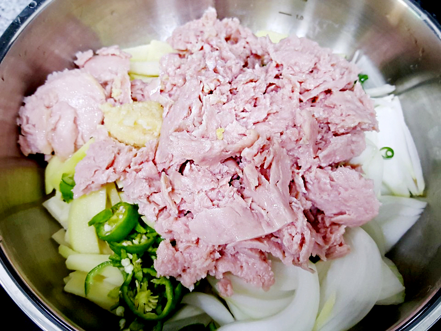 저는 감자 짜글이를 만들 때는 스팸이나 리챔을 주로 이용해서 하는데요. 항상 끓는 물에 한번 데쳐서 기름기를 제거하고 사용합니다. 위생봉지에 넣어서 손으로 눌러 으깨 줍니다. 큼직큼직하게 으깨주셔도 되어요~
