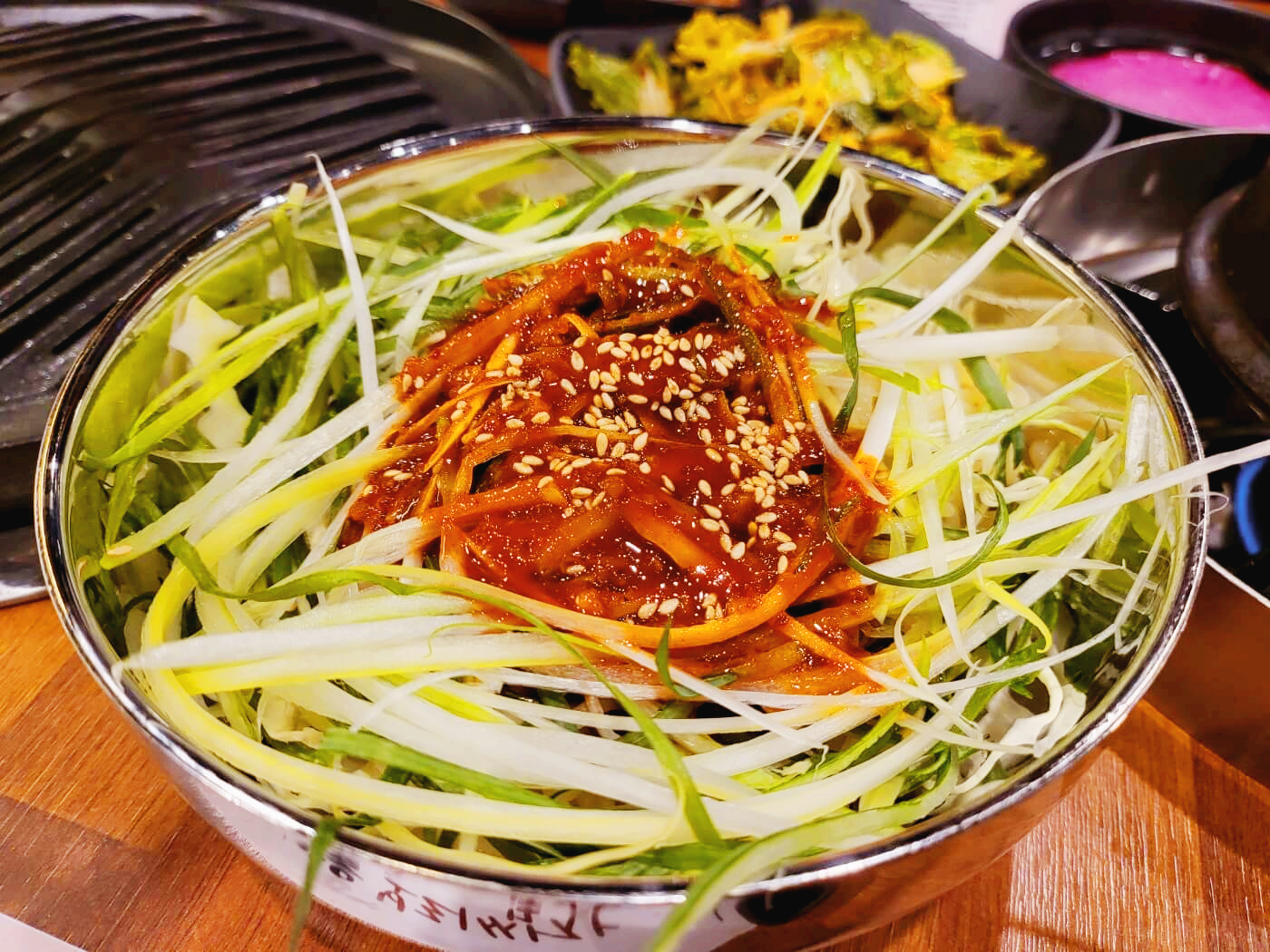 기본반찬도 푸짐해요~ 한마음정육식당의 시그니처 밑반찬이라고 할 수 있는 쫄면 파무침~ 파무침에 쫄면까지 더해져서 쌈싸먹기 좋아요~그리고 된장찌개도 정말 맛있어요!