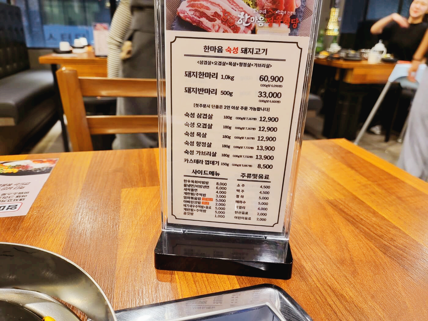 오창 삼겹살, 소고기 맛집인 한마음 정육식당의 메뉴판을 살펴보면 돼지한마리, 돼지반마리, 소고기 한 마리 소고기 반마리, 이런 식으로 주문할 수 있어요. 저희는 4인가족 기준으로 고기를 잘 먹는 편인데 돼지 한 마리 + 돼지 반마리를 추가했습니다. 돼지 한 마리 구성부위는 삼겹살+오겹살+목살+항정살+가브리살로 이루어져 있습니다.