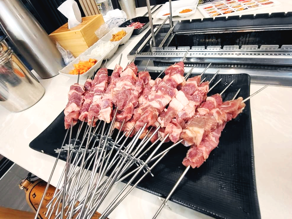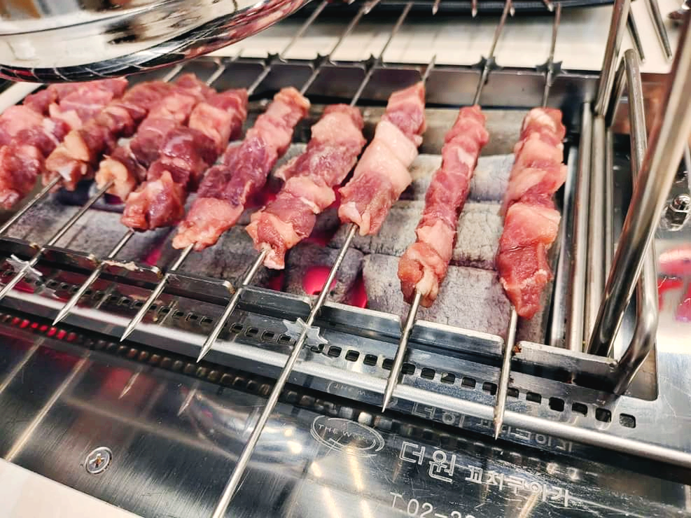 테이블마다 양꼬치를 구워 먹을 수 있도록 숯불이 설치되어있습니다. 처음에 회전하는 숯불 양꼬치를 보고 아이들이 정말 신기해했었는데, 이번에서 자기들이 직접 하겠다고 나서니 저는 할 일이 없어지더라고요.