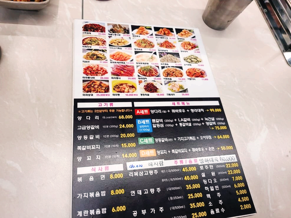 메뉴판을 쭉 살펴보니 종류가 정말 많더라고요. 친정아버지께서 먹고 싶은 거 다 시키라고 통 크게 쓰신다고 하셨지만 저희는 양꼬치와 꿔바로우, 쪽갈비꼬치, 마라탕을 먹었어요. 지금 보니 D 세트에 저희가 먹은 요리가 다 포함되어있네요. 다양하게 먹을 수 있는 세트 종류도 있기 때문에 취향에 따라 골라먹으면 될 것 같습니다.