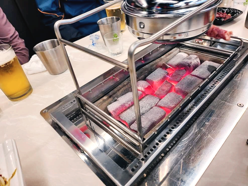 테이블마다 양꼬치를 구워 먹을 수 있도록 숯불이 설치되어있습니다. 처음에 회전하는 숯불 양꼬치를 보고 아이들이 정말 신기해했었는데, 이번에서 자기들이 직접 하겠다고 나서니 저는 할 일이 없어지더라고요.