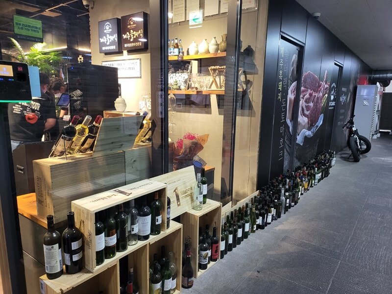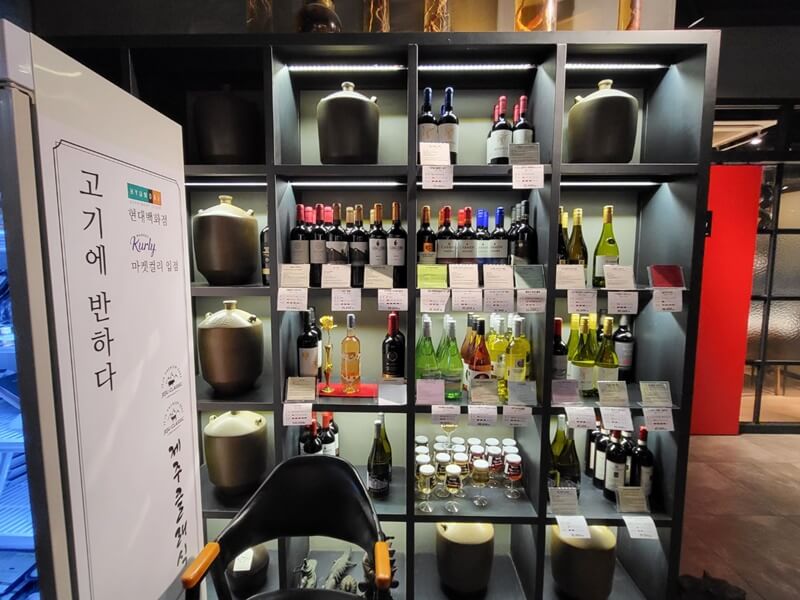 어찌 됐든 오창 제주클래식 매장에 들어서면 입구에는 각종 와인이 즐비해있습니다. 종류가 정말 다양하고 많더라고요. 며칠 전에 와인을 무식하게 너무 많이 먹어서,,, 와인만 봐도 머리가 아픕니다. 저희는 이날 이슬이와 함께 했어요.