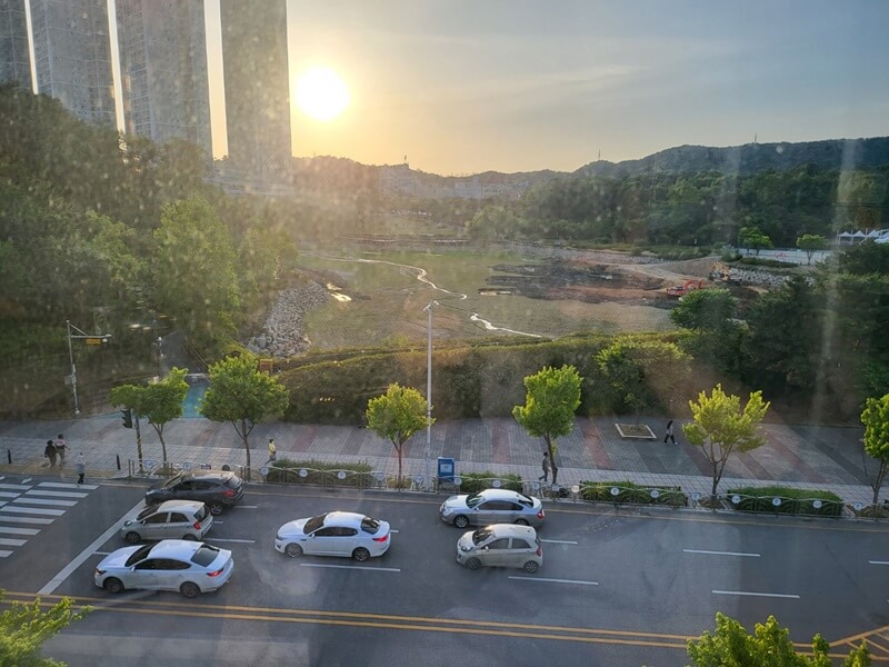 오창 호수공원이 보이는 창가에 자리를 잡았습니다. 하지만 호수공원에서 한창 물을 퍼내고 공사 중인지라 호수는 볼 수 없었어요. 언제쯤 호수가 채워질지 알 수가 없네요. 그럼에도 불구하고 뷰가 참 좋습니다~