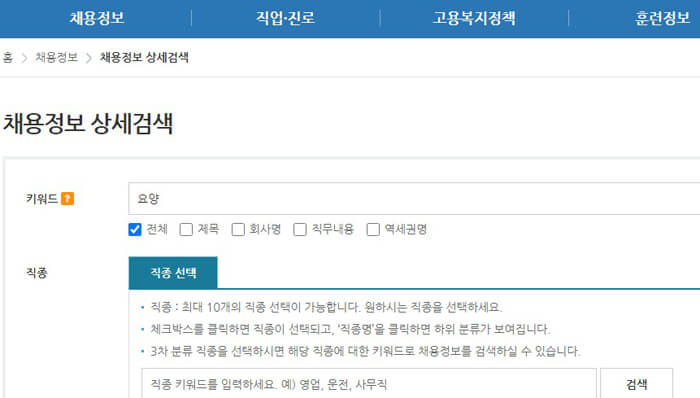4. 채용정보 상세검색에서 키워드 입력란에 '요양'이나 '요양보호사'라고 검색어를 입력해주세요.