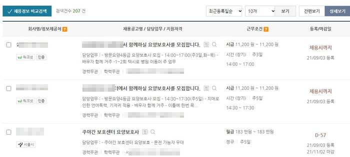 6. 경력, 학력, 고용형태, 희망임금, 기업형태, 근무형태 등등 검색 조건을 확인하시고 검색을 클릭합니다. 그럼 워크넷 요양보호사 구인구직 정보를 확인을 할 수가 있습니다. 원하는 업체를 클릭합니다.